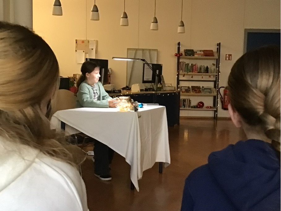 Am Anfang halfen zwei Schülerinnen beim Dekorieren. Dann startete der Wettbewerb, zuerst durften die Teilnehmerinnen und Teilnehmer ihre eigenen Textstellen, mit der sie auch in der Klasse gewonnen haben, vorlesen. Als alle vorgelesen haben, wurden die Bewertungen zusammengezählt und die Kinder durften zwischendurch etwas naschen, um die Nerven zu beruhigen. Als alle Auswertungen der ersten Runde zusammengezählt waren, begann die zweite Runde, in der noch alle dabei waren. Nach der zweiten Runde wurden auch nochmal alle Ergebnisse aller Runden zusammengezählt. Nach der Auswertung stand die Siegerehrung an und es wurde die Gewinnerin gekürt.