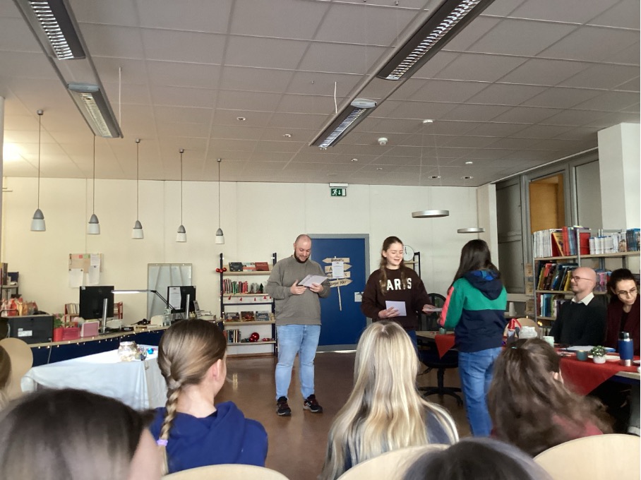 In jeder Klasse wurden zwei Kinder ausgewählt, die dann auch bei dem Wettbewerb teilnehmen durften. Bei dem Wettbewerb wurden drei Plätze geehrt. Die Siegerin ist aus der Klasse 6d. Der zweite Platz ging an Mathilda aus der 6b und der dritte Platz ging an Line aus der 6b. Nach dem Lesewettbewerb wurden die Teilnehmer interviewt, genauso wie die Lehrer.